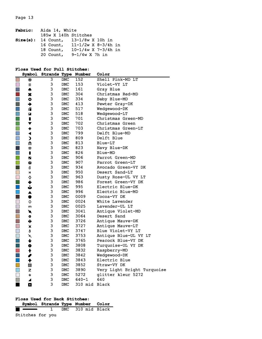 * The pattern pages are in colored blocks & Black and white. 43 DMC colors